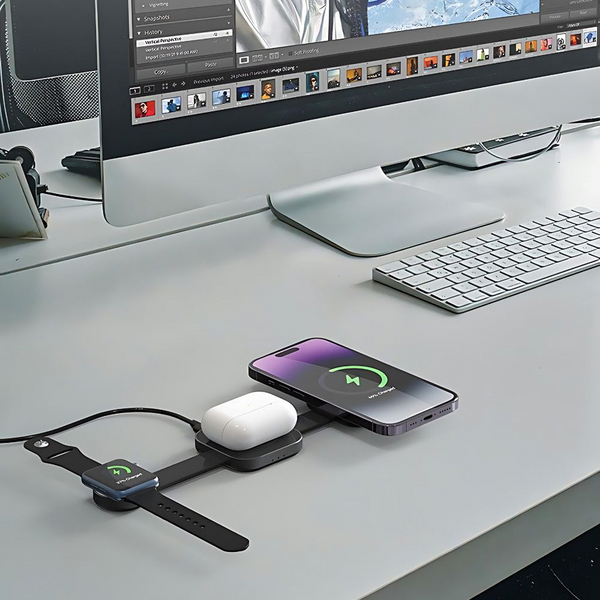 Laden Sie iPhone, Apple Watch und AirPods gleichzeitig – reduziert Kabelsalat und hält Ihre Geräte in einer praktischen Station organisiert.