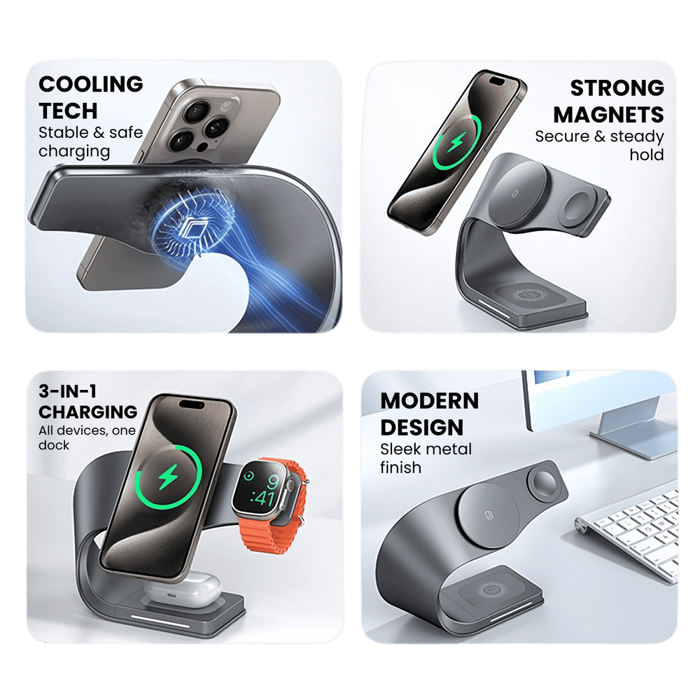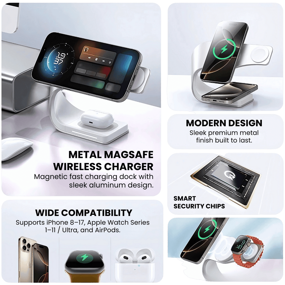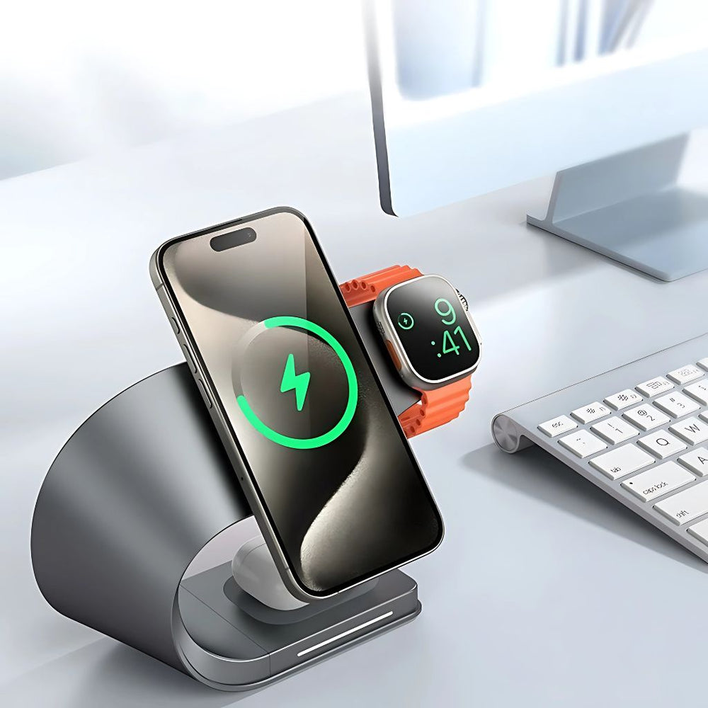 Lade iPhone, Apple Watch und AirPods gleichzeitig – eine elegante Metallstation ersetzt mehrere Ladegeräte.