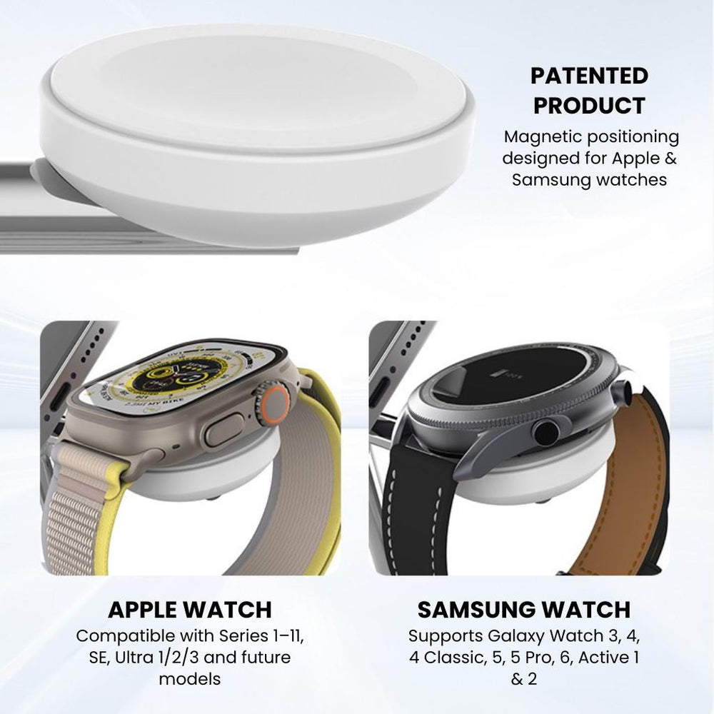 Laden Sie Ihr iPhone, Ihre Apple Watch (oder Samsung Galaxy Watch) und Ihre AirPods gleichzeitig über eine kompakte Ladestation.